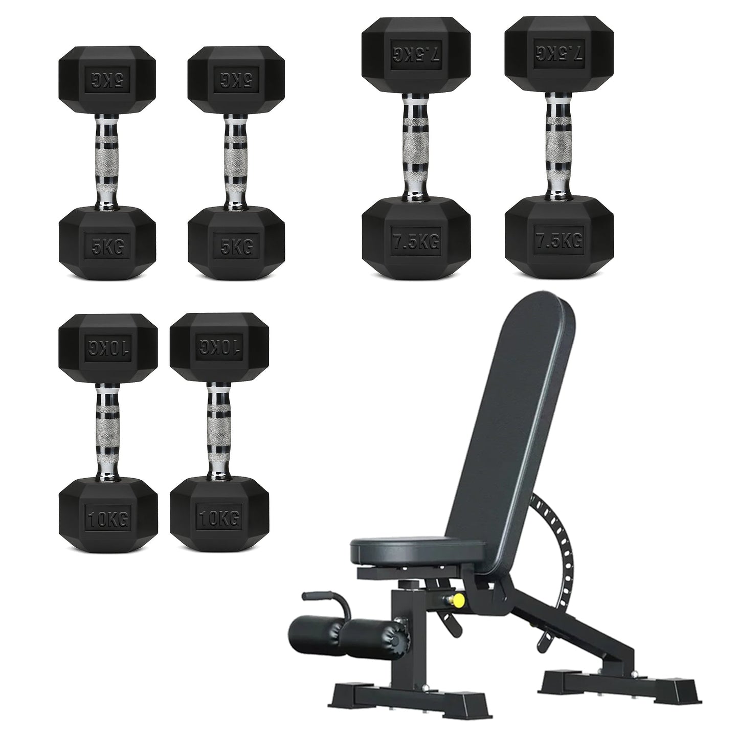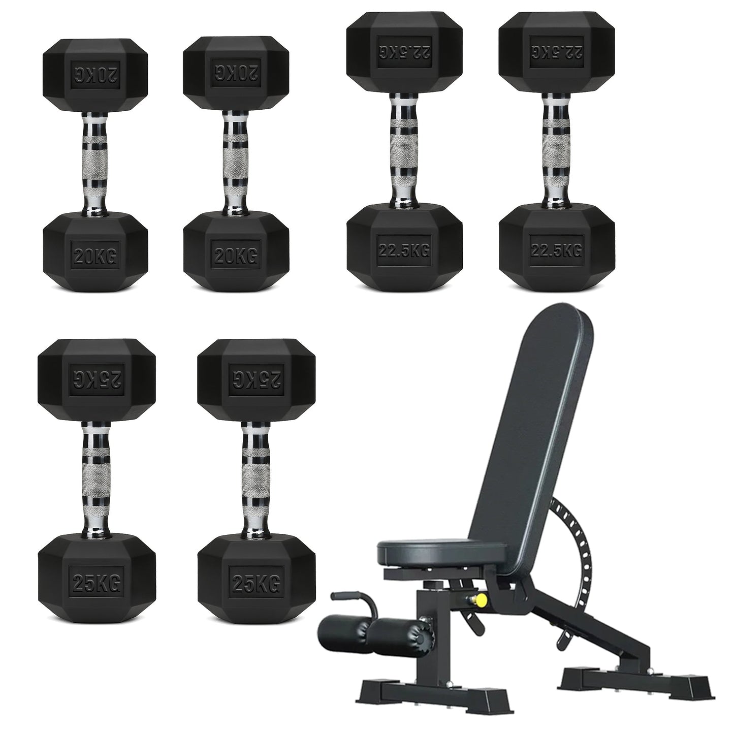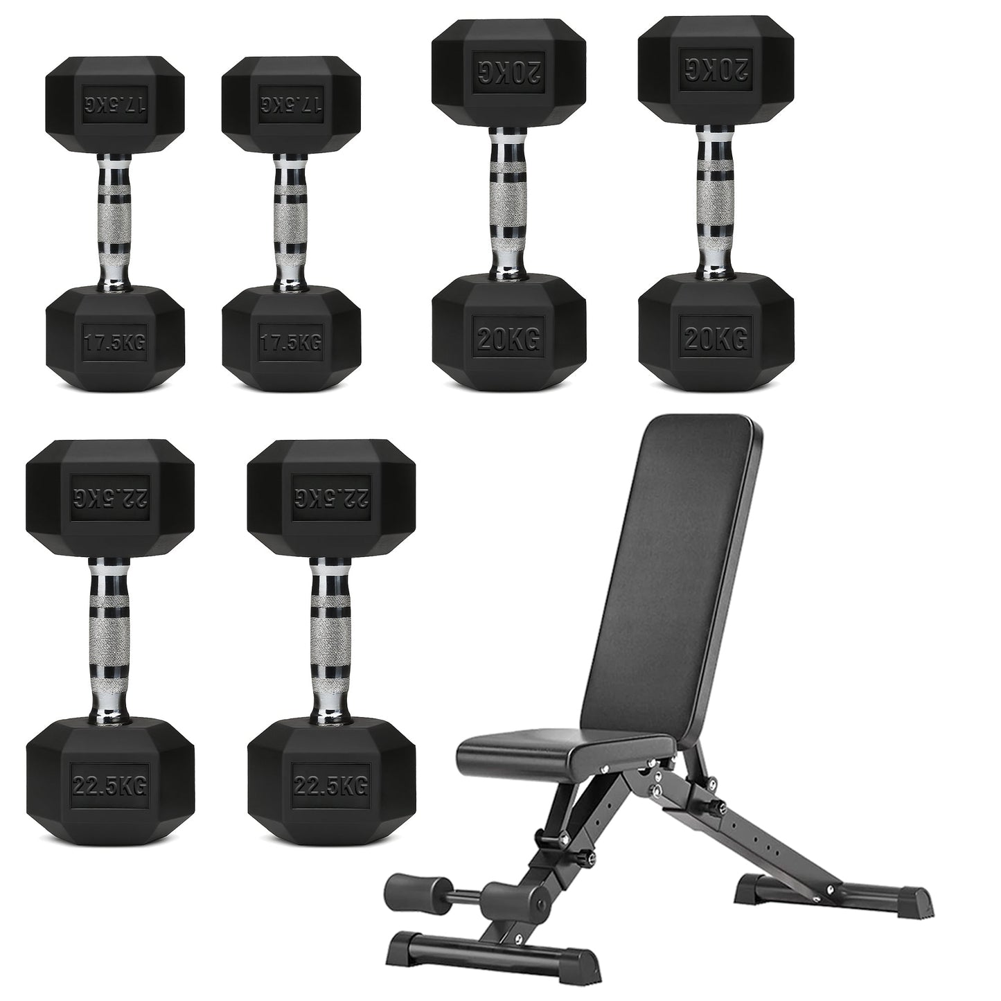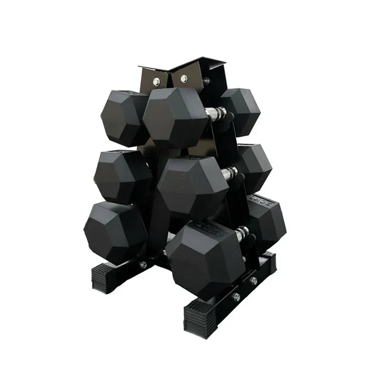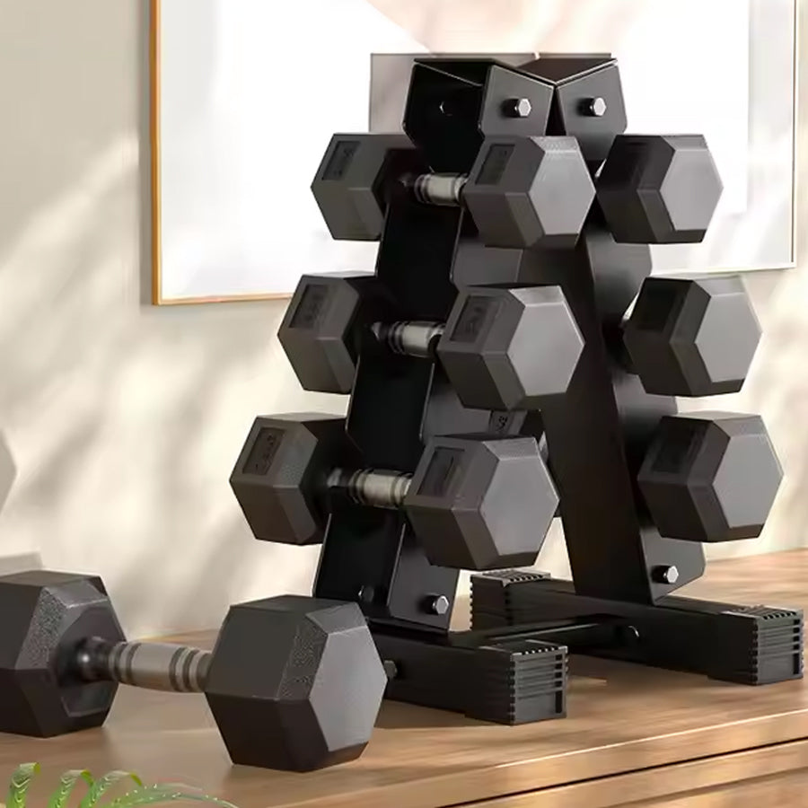 Hex Dumbbell Set with 3-Tier Tree Rack & Optional Bench – Rubber Coated Anti-Roll Weights for Home Gym