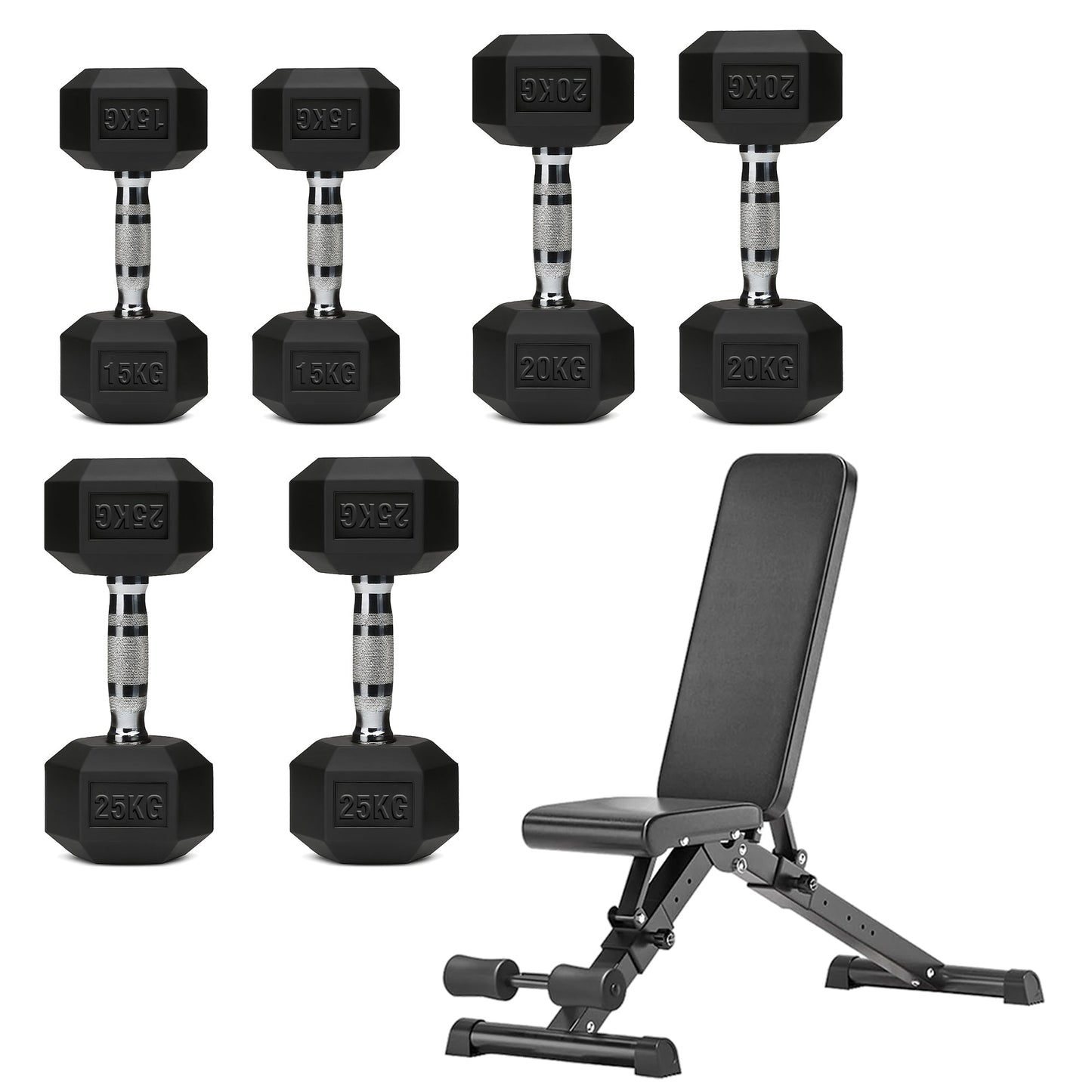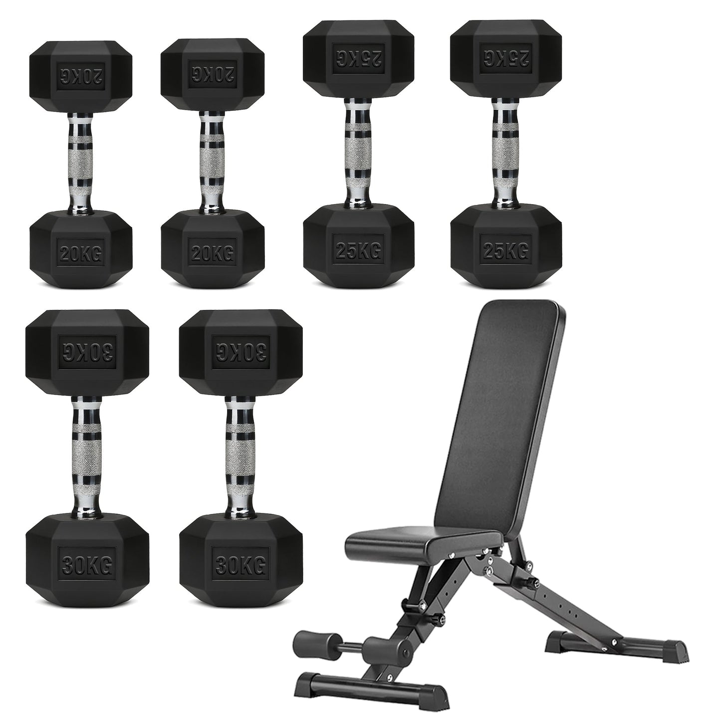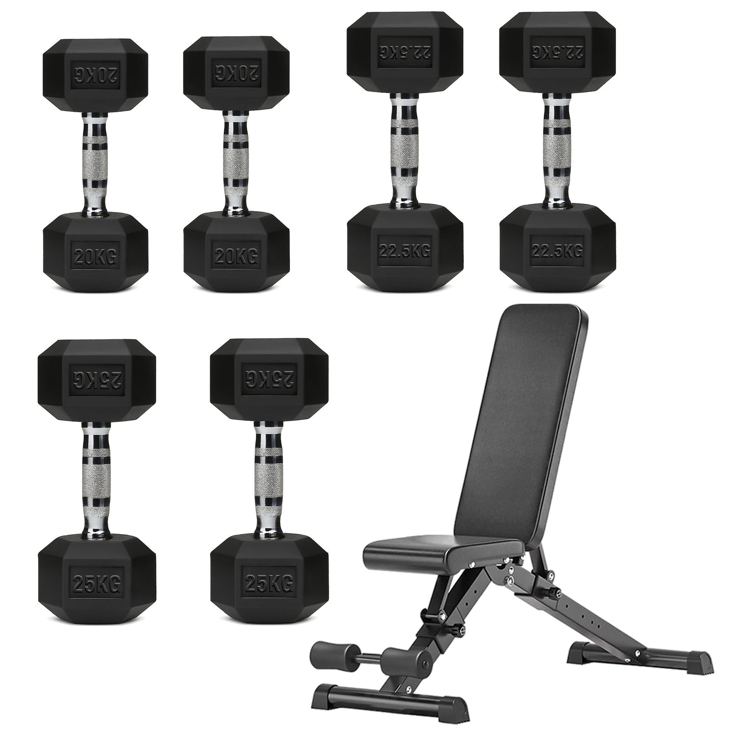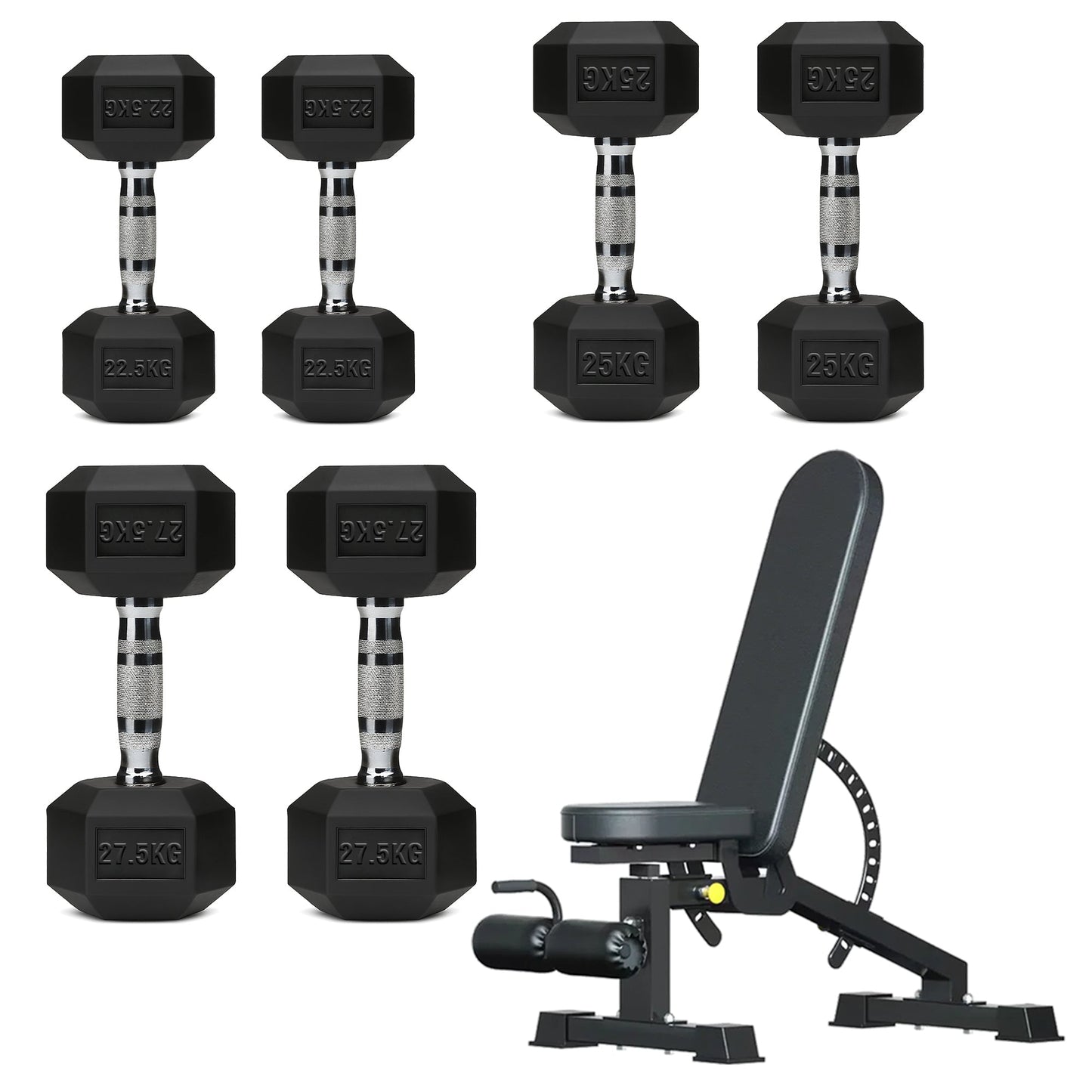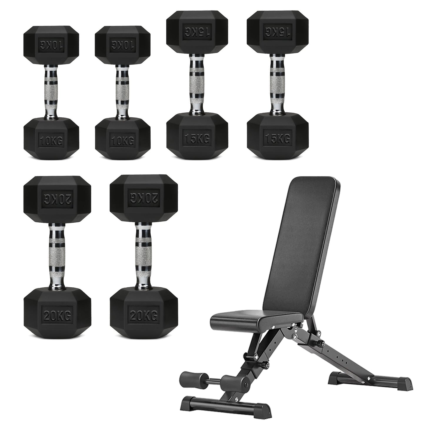 Hex Dumbbell Set with 3-Tier Tree Rack & Optional Bench – Rubber Coated Anti-Roll Weights for Home Gym